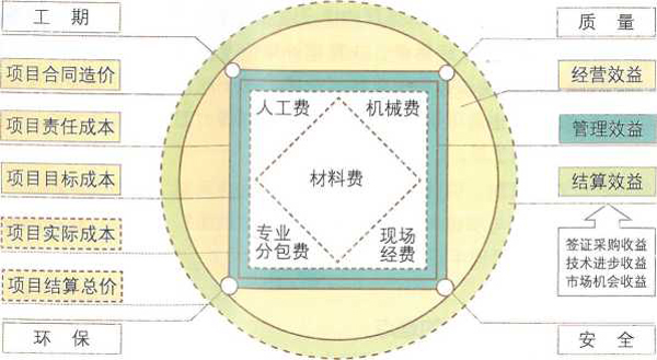 “方圓圖”是具有操作性的工具。其一,“方圓圖” 完整詮釋了建筑項(xiàng)目管理行為間的關(guān)系。“接項(xiàng)目”確定了合同造價(jià),對(duì)應(yīng)方圓圖的實(shí)線圓;“做項(xiàng)目”的第一步是下達(dá)項(xiàng)目目標(biāo)責(zé)任書,確定項(xiàng)目責(zé)任成本,對(duì)應(yīng)方圓圖的責(zé)任成本方形,第二步分子公司在責(zé)任書的基礎(chǔ)上進(jìn)行項(xiàng)目實(shí)施策劃,產(chǎn)生項(xiàng)目的目標(biāo)成本,對(duì)應(yīng)方圓圖的目標(biāo)成本方形,第三步就是項(xiàng)目實(shí)施過程的管控,最終確定實(shí)際成本,對(duì)應(yīng)方圓圖的實(shí)際成本方形?!八阗~收錢”就是完成項(xiàng)目過程中的結(jié)算變更與最后的決算收款,從而確定結(jié)算造價(jià),對(duì)應(yīng)方圓圖的結(jié)夢(mèng)造價(jià)虛線圓。項(xiàng)目實(shí)施過程中進(jìn)度、質(zhì)量、安全、環(huán)保及周邊相關(guān) 方的管理對(duì)應(yīng)成本方形的四個(gè)支撐頂點(diǎn),構(gòu)成成本的五項(xiàng)費(fèi)用“材料、人工、機(jī)械、現(xiàn)場(chǎng)經(jīng)費(fèi)、專業(yè)分包”對(duì)應(yīng)成本方形的內(nèi)部區(qū)域。