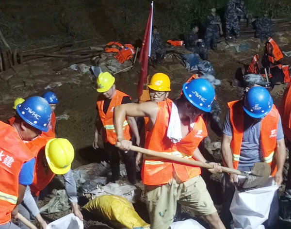 7月14日14時(shí),封堵作業(yè)正式啟動(dòng),南北兩岸同時(shí)進(jìn)占施工。然而,困難層出不窮:道路不平,存在積水,影響車輛通行;一線搶險(xiǎn)人員的生活保障還不夠完善,吃住條件艱苦,防雨防曬防蚊設(shè)施簡(jiǎn)陋,無(wú)便攜照明設(shè)施;砂石骨料耗量巨大,但存在配額限制,獲取來(lái)源較少。但現(xiàn)場(chǎng)人員攻堅(jiān)克難,積極與政府、當(dāng)?shù)丶捌h(yuǎn)廠商溝通,解決了人員基本需求和石料問(wèn)題,并在當(dāng)日順利鋪石20米,邁上堅(jiān)實(shí)的第一步。